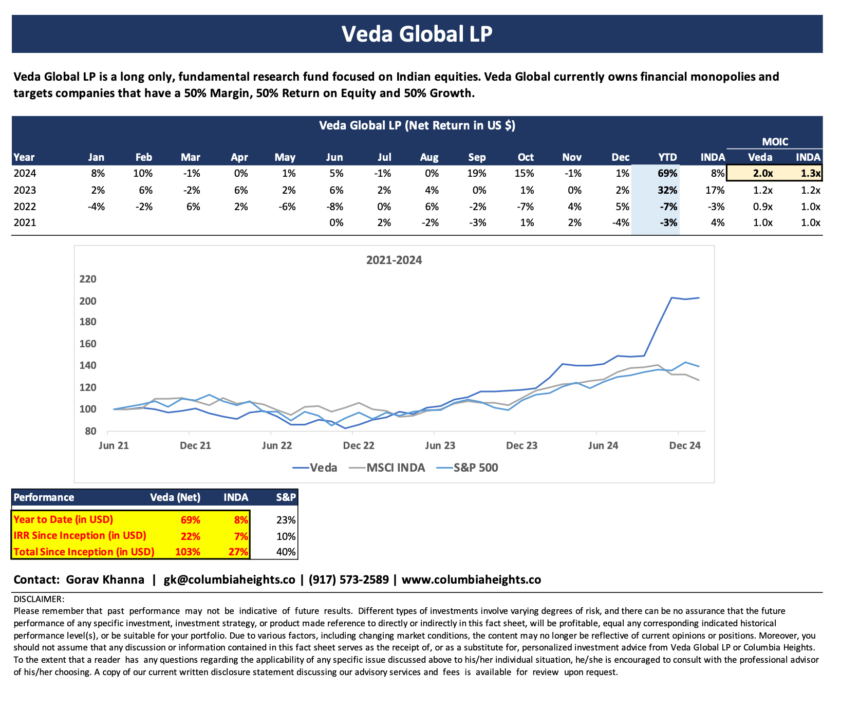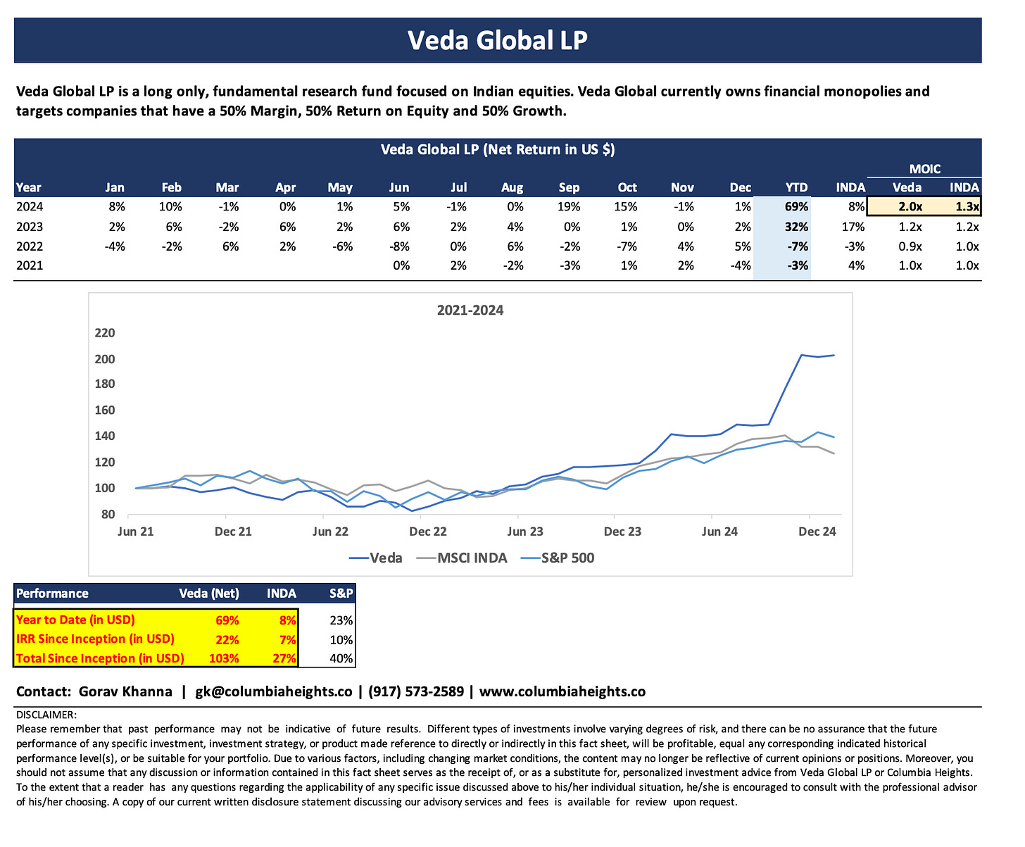 Veda Global LP Total return since 2021 inception is 103% vs the MSCI India (Ticker: INDA) benchmark return of 27%.