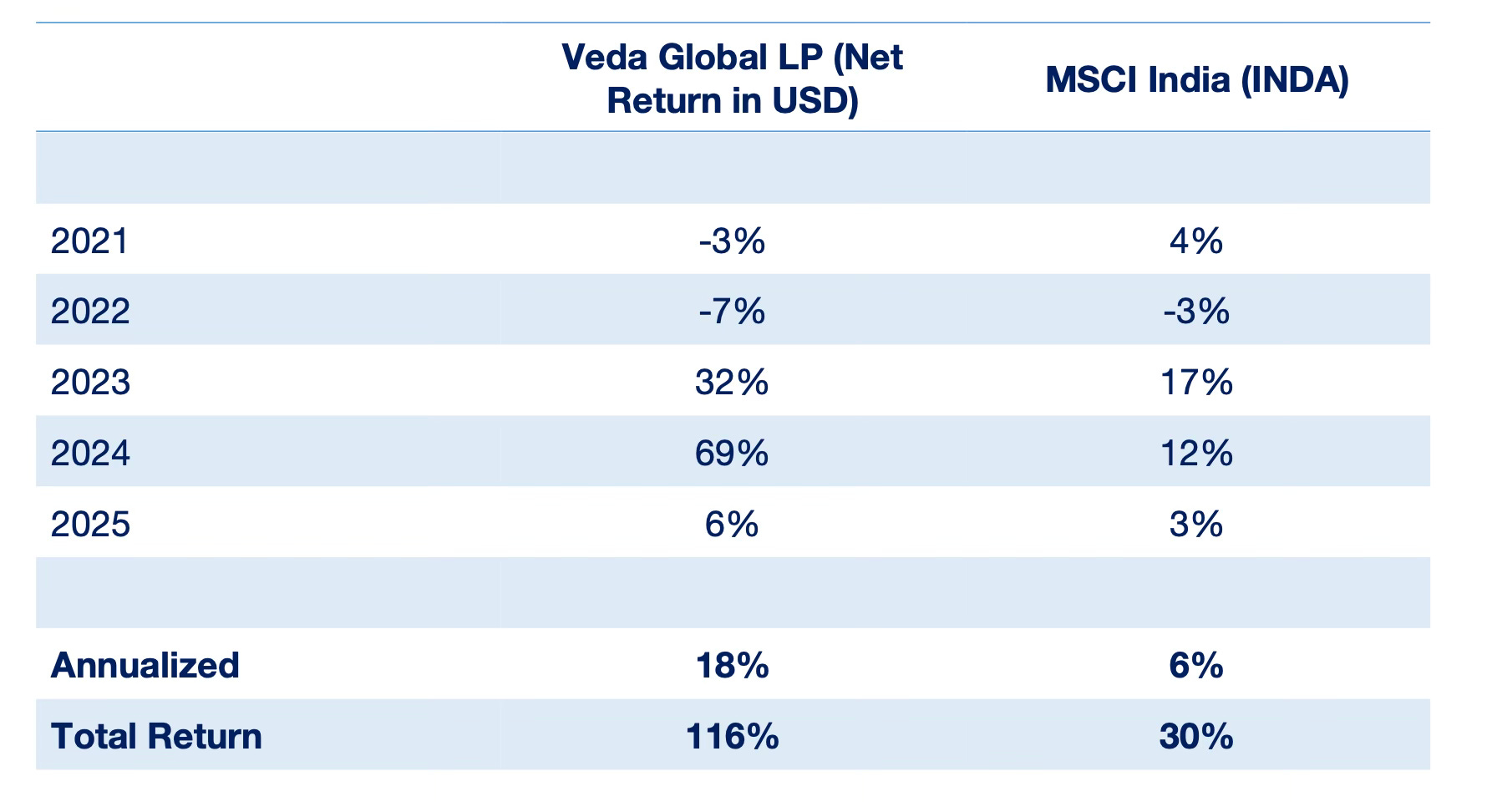 We are pleased to provide updated Veda Global LP returns above.