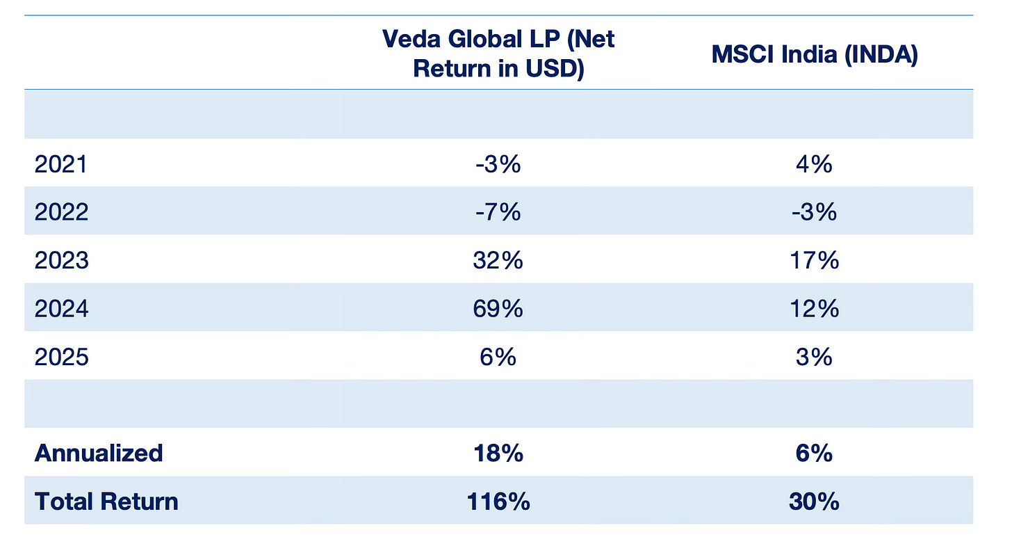 Veda Global was established in 2021 and has outperformed its benchmark since inception. The strategy initially focused on buying India listed credit rating agencies. We have since bought positions in other financial monopolies. The goal is to buy businesses that have high ROE, high margins and growth.